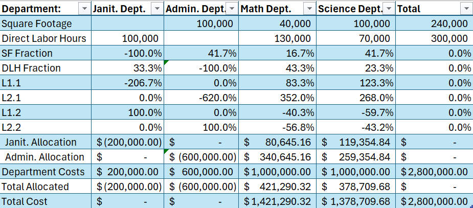 Used Excel to showcase and compare cost allocation methods. Discussed their relation to corporate governance. Implemented a novel "Lattice Allocation" method(Bent, Caplan 2017) based on matrix principles of Linear Algebra. Results were within 0.1% error after only 3 operations.